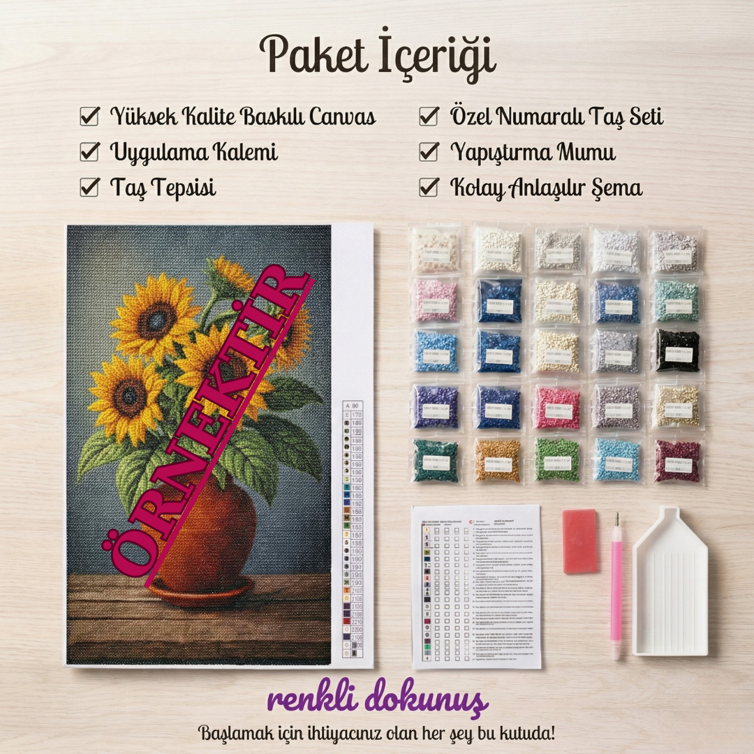 Her satın alımda eksiksiz elmas boyama setini gönderiyoruz. Tüm araç gereçleri, tuvali ve ihtiyacınız olan tüm elmasları alacaksınız. Ayrıca, %10 daha fazla elmas taş da gönderiyoruz, böylece bazılarını kaybetseniz bile her zaman yeterli taşınız olur!